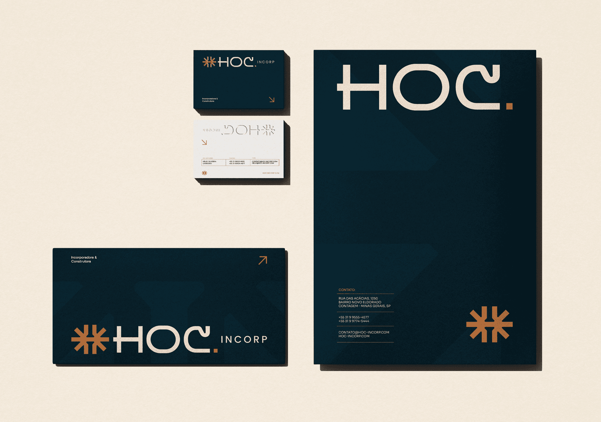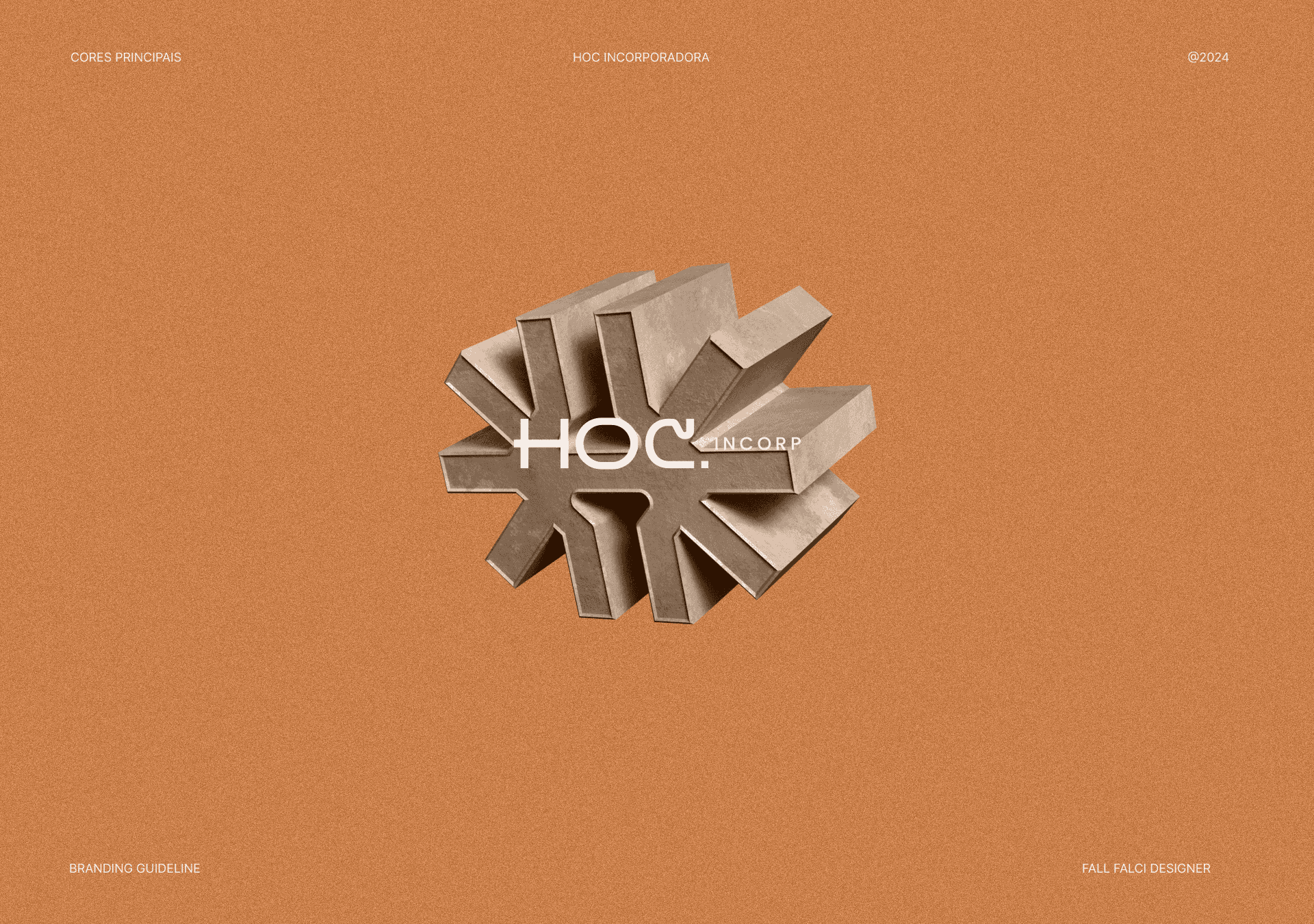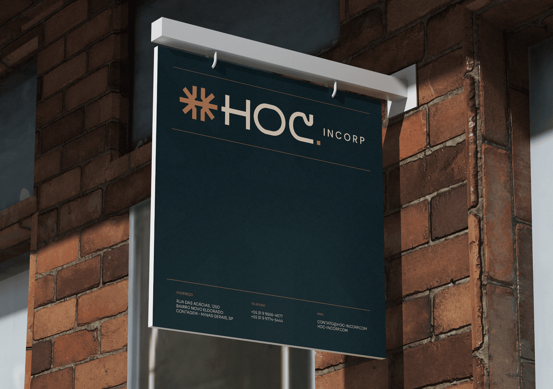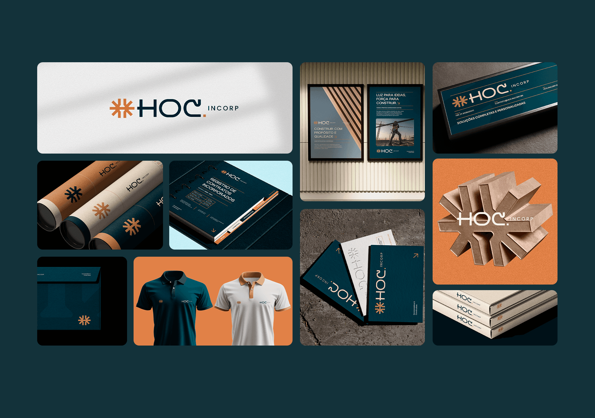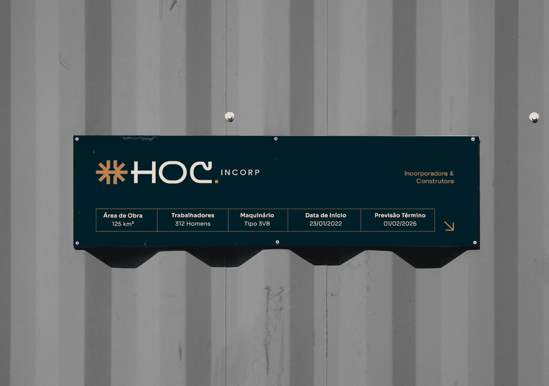 Identidade visual desenvolvida para a HOC Incorporadora, com um símbolo que funde três elementos centrais: o sol, a letra H e o prego. Essa combinação traduz o equilíbrio entre pensamento estratégico e execução prática. Formas geométricas precisas, tipografia sofisticada e uma paleta de laranja terroso com verde profundo compõem um sistema visual que comunica solidez, calor humano e confiança.