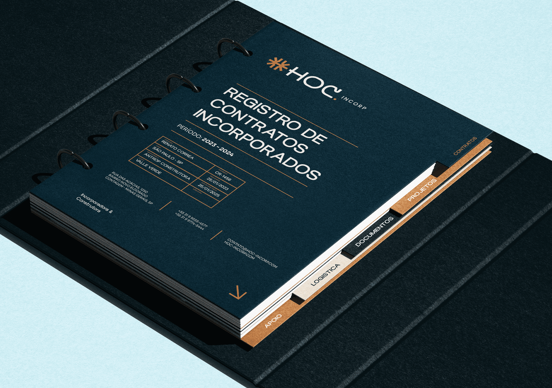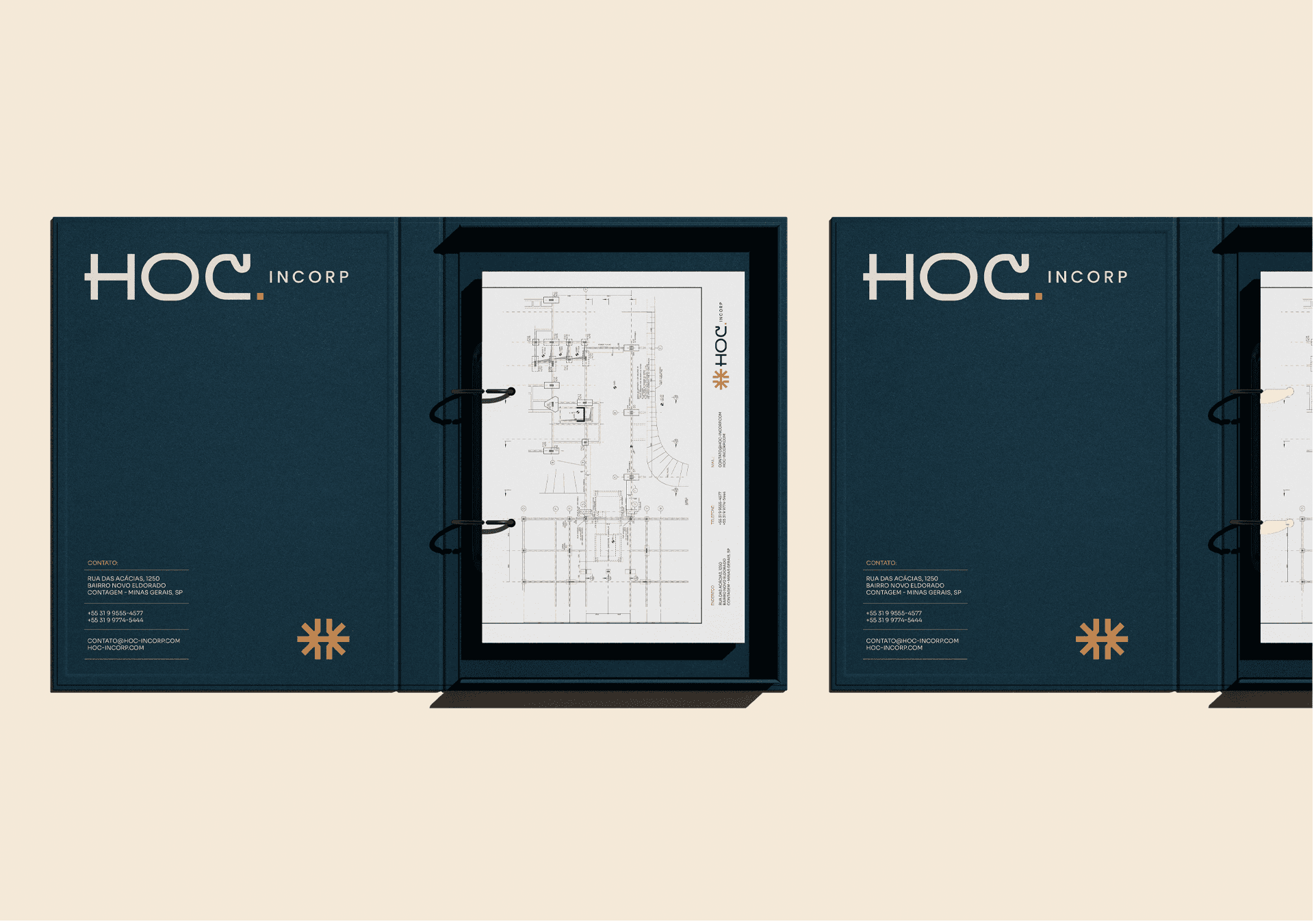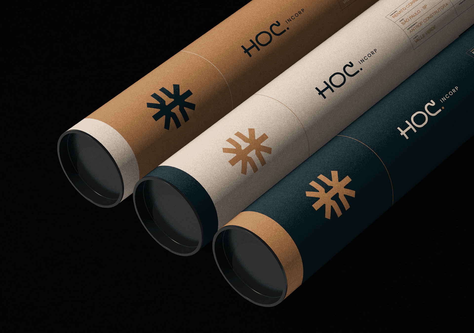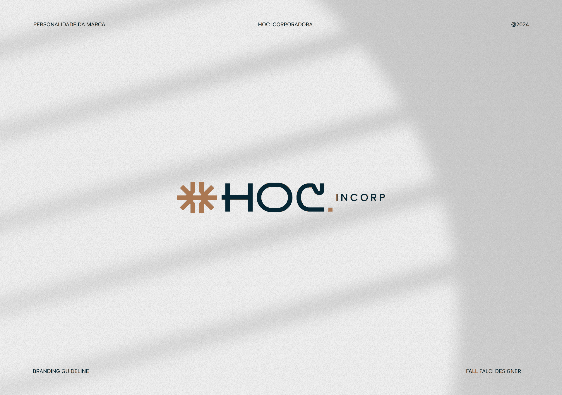 Identidade visual desenvolvida para a HOC Incorporadora, com um símbolo que funde três elementos centrais: o sol, a letra H e o prego. Essa combinação traduz o equilíbrio entre pensamento estratégico e execução prática. Formas geométricas precisas, tipografia sofisticada e uma paleta de laranja terroso com verde profundo compõem um sistema visual que comunica solidez, calor humano e confiança.