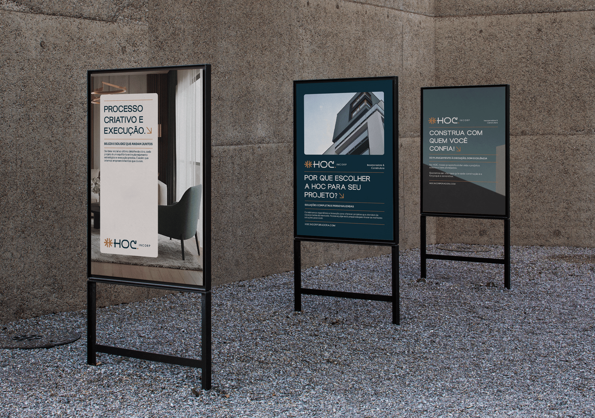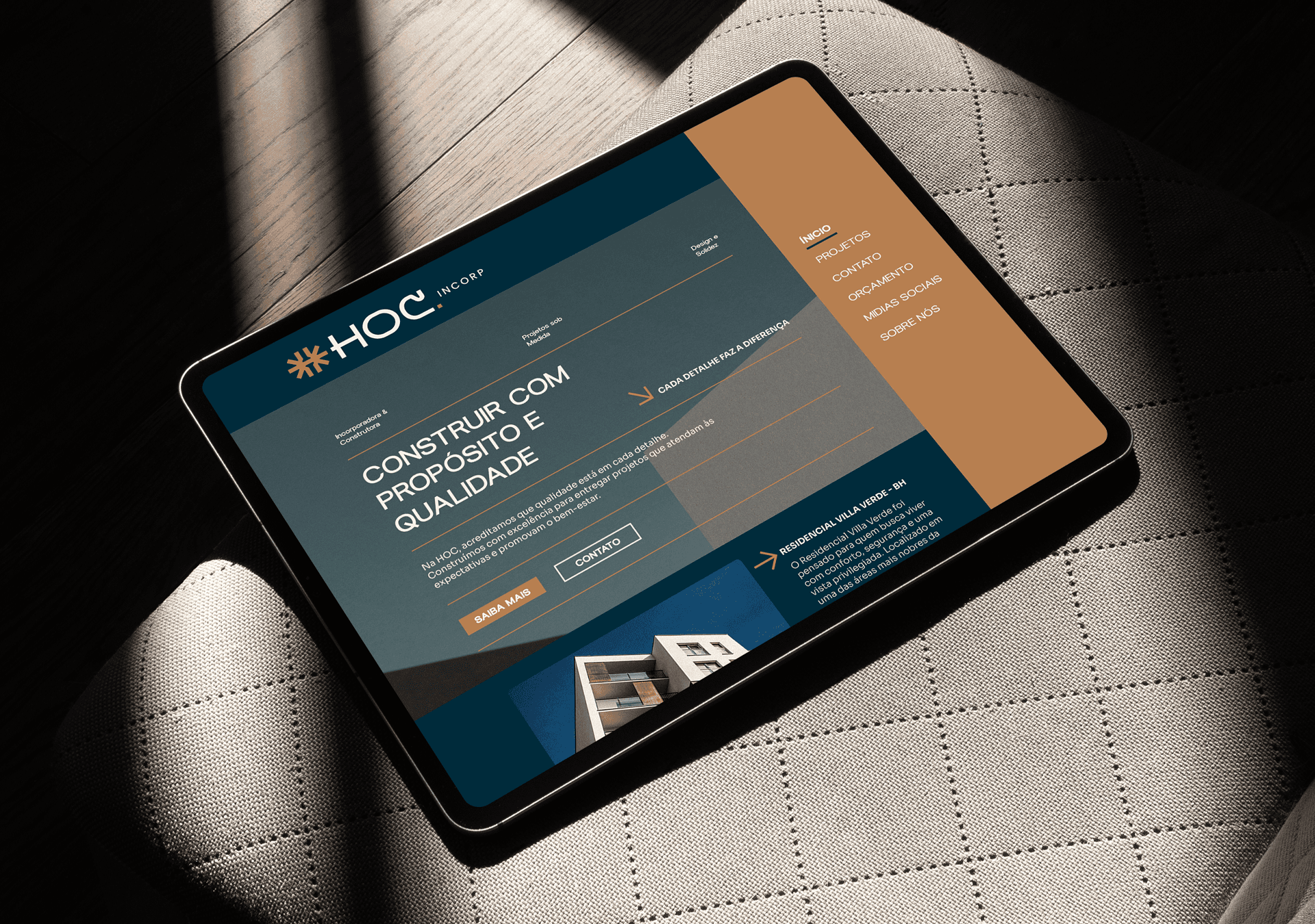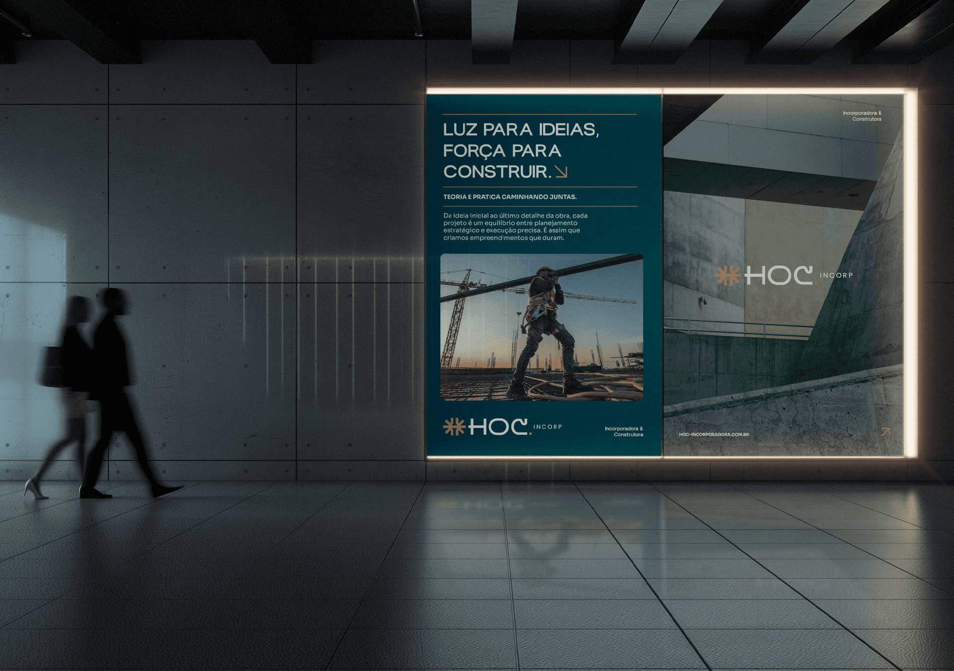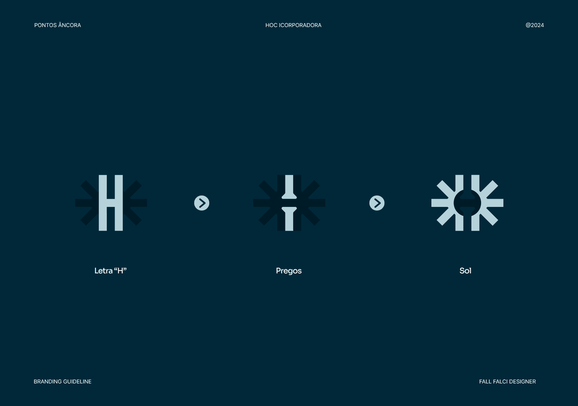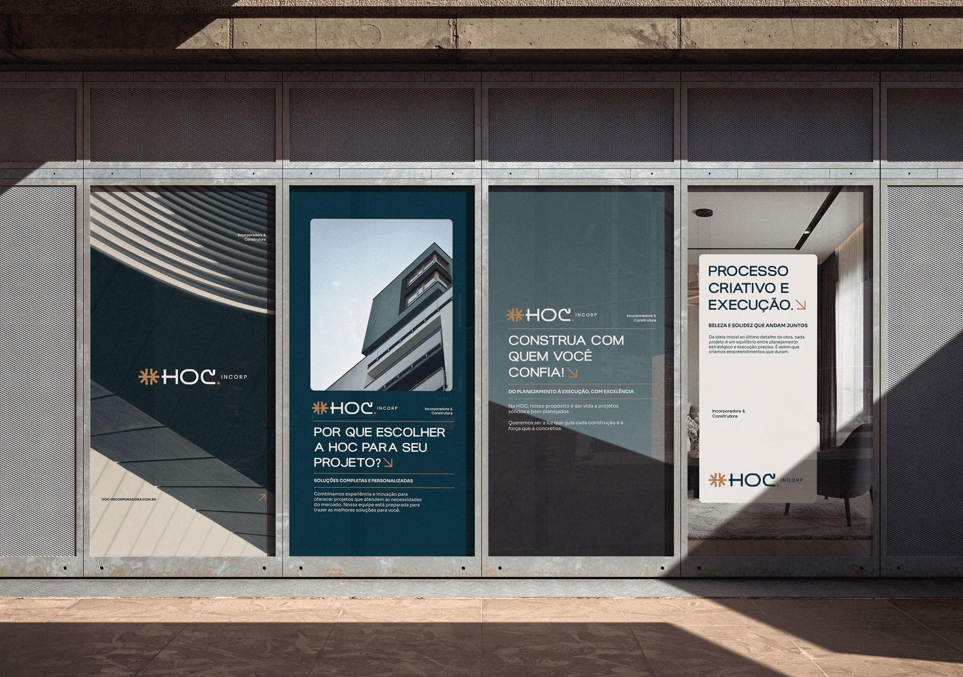 Identidade visual desenvolvida para a HOC Incorporadora, com um símbolo que funde três elementos centrais: o sol, a letra H e o prego. Essa combinação traduz o equilíbrio entre pensamento estratégico e execução prática. Formas geométricas precisas, tipografia sofisticada e uma paleta de laranja terroso com verde profundo compõem um sistema visual que comunica solidez, calor humano e confiança.