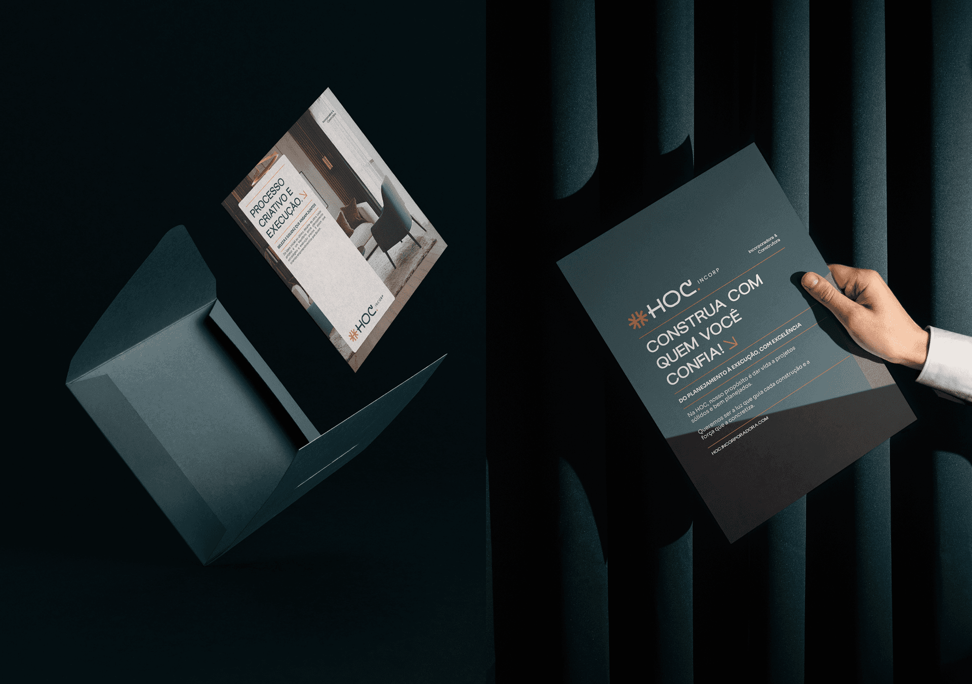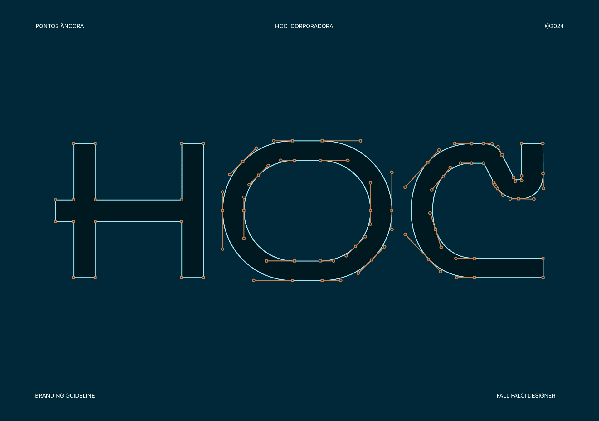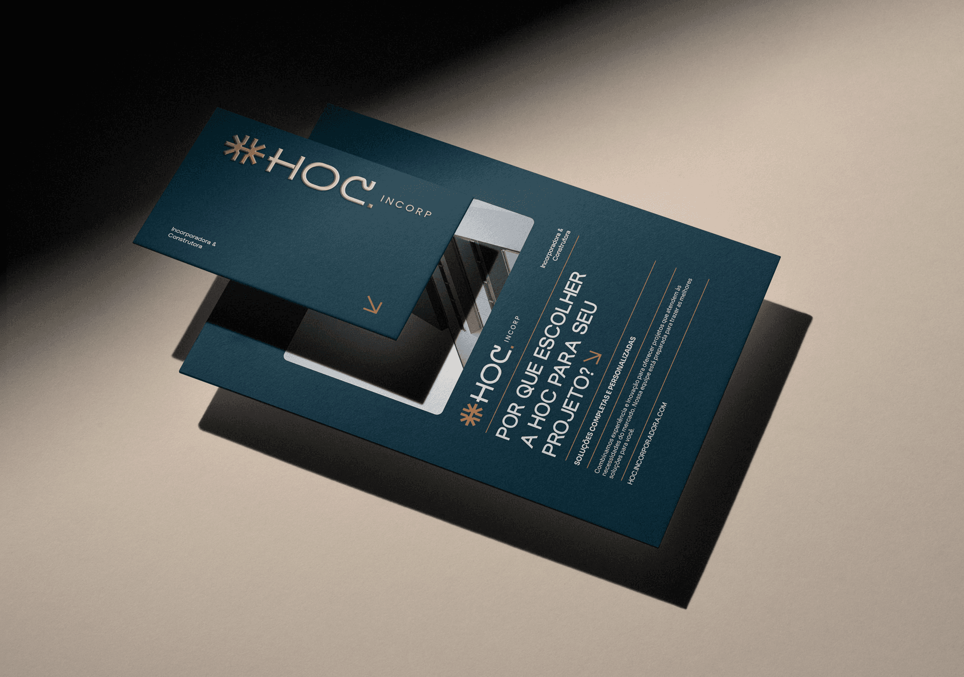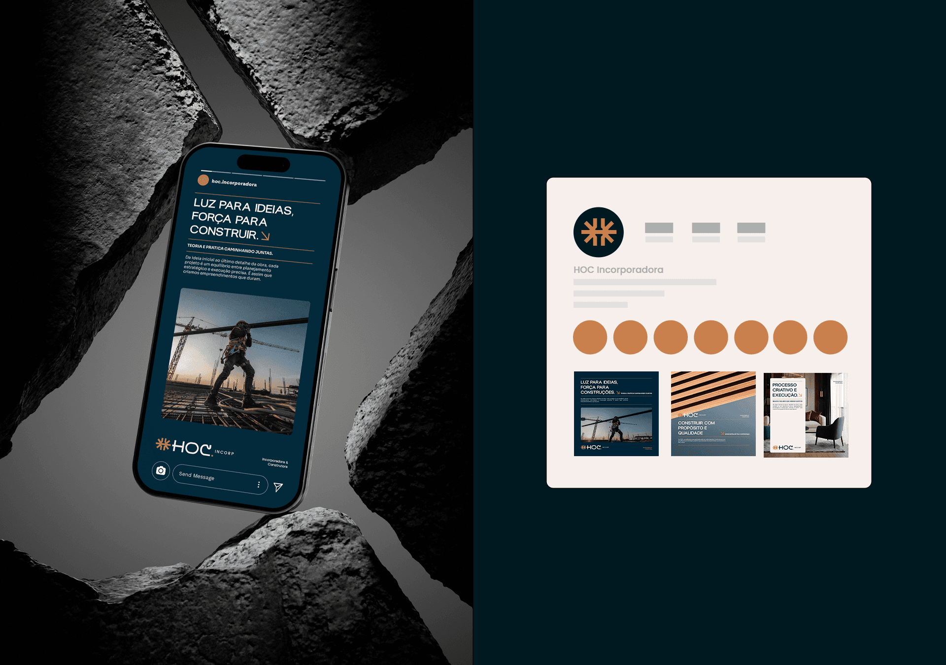 Identidade visual desenvolvida para a HOC Incorporadora, com um símbolo que funde três elementos centrais: o sol, a letra H e o prego. Essa combinação traduz o equilíbrio entre pensamento estratégico e execução prática. Formas geométricas precisas, tipografia sofisticada e uma paleta de laranja terroso com verde profundo compõem um sistema visual que comunica solidez, calor humano e confiança.