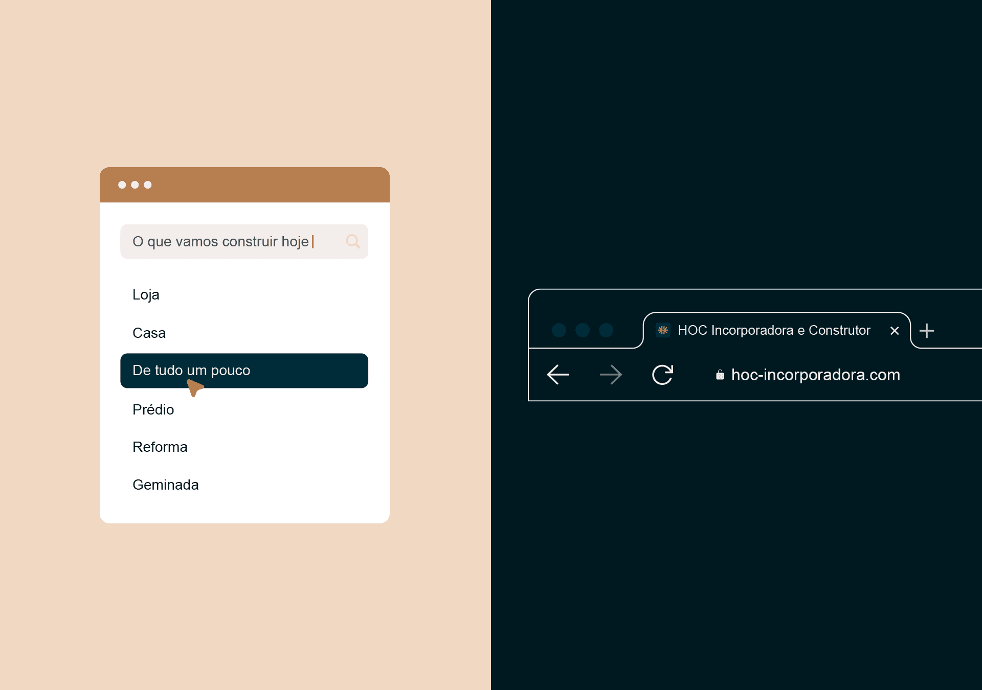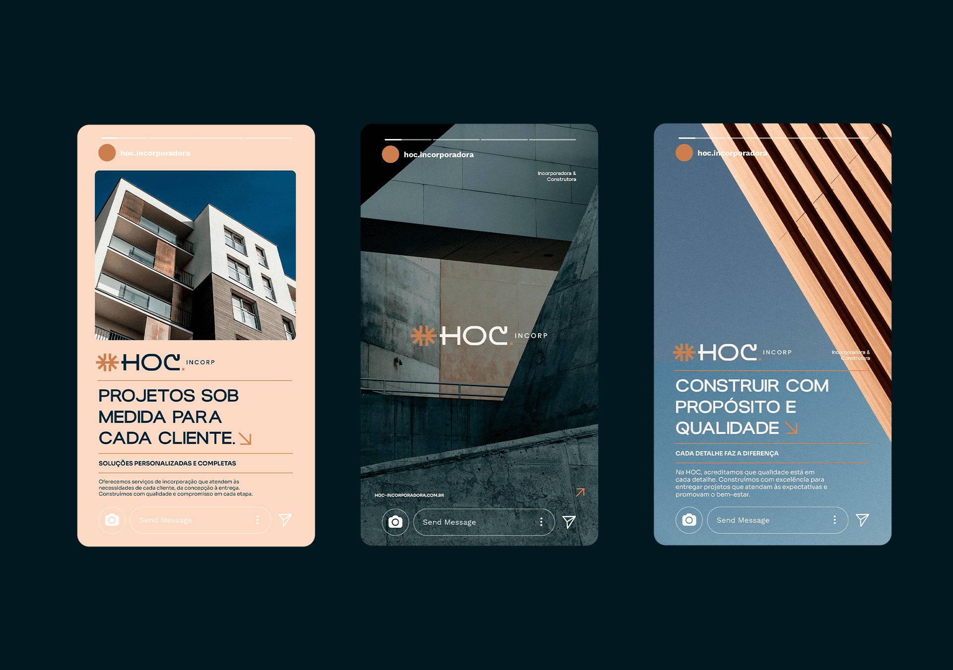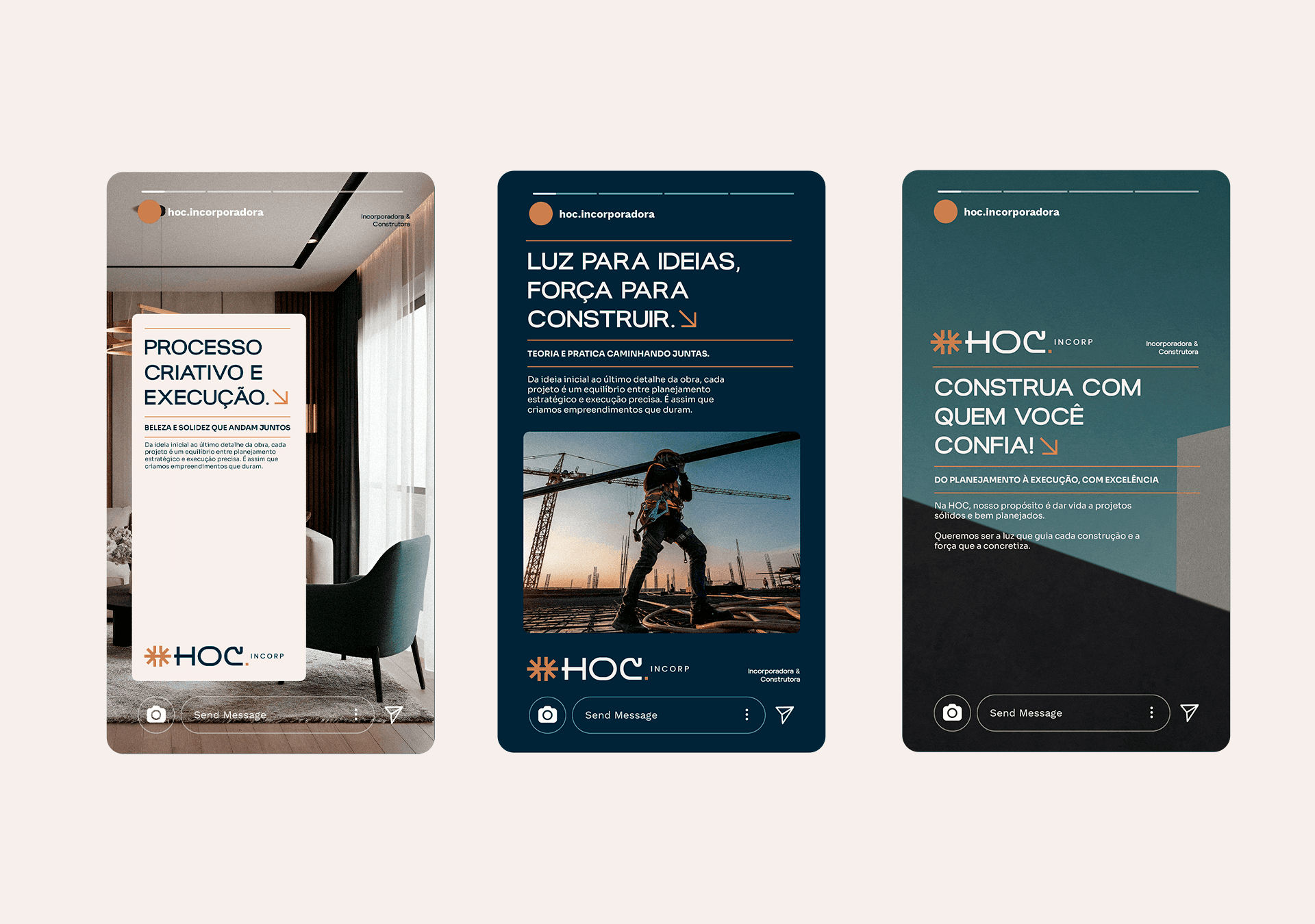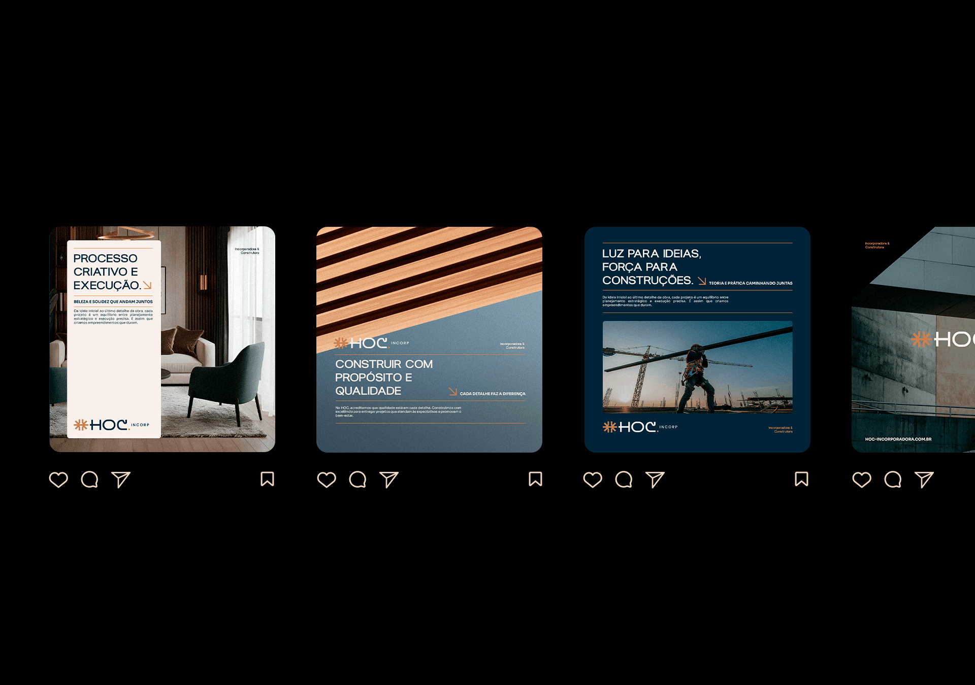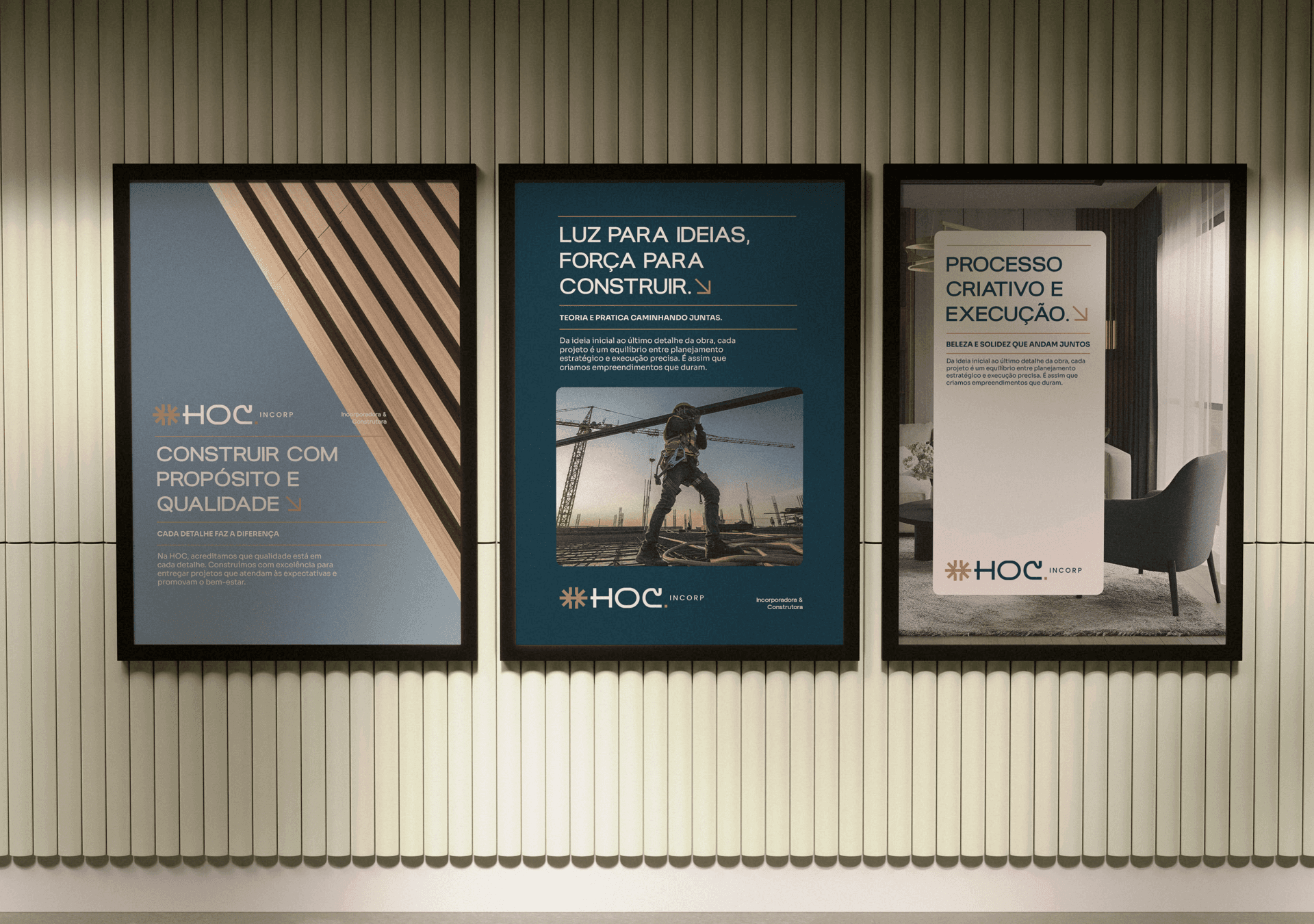 Identidade visual desenvolvida para a HOC Incorporadora, com um símbolo que funde três elementos centrais: o sol, a letra H e o prego. Essa combinação traduz o equilíbrio entre pensamento estratégico e execução prática. Formas geométricas precisas, tipografia sofisticada e uma paleta de laranja terroso com verde profundo compõem um sistema visual que comunica solidez, calor humano e confiança.