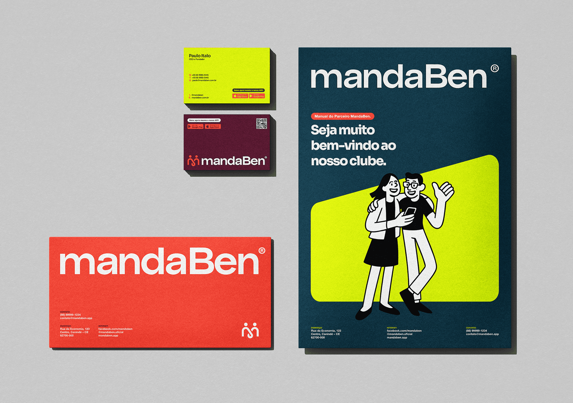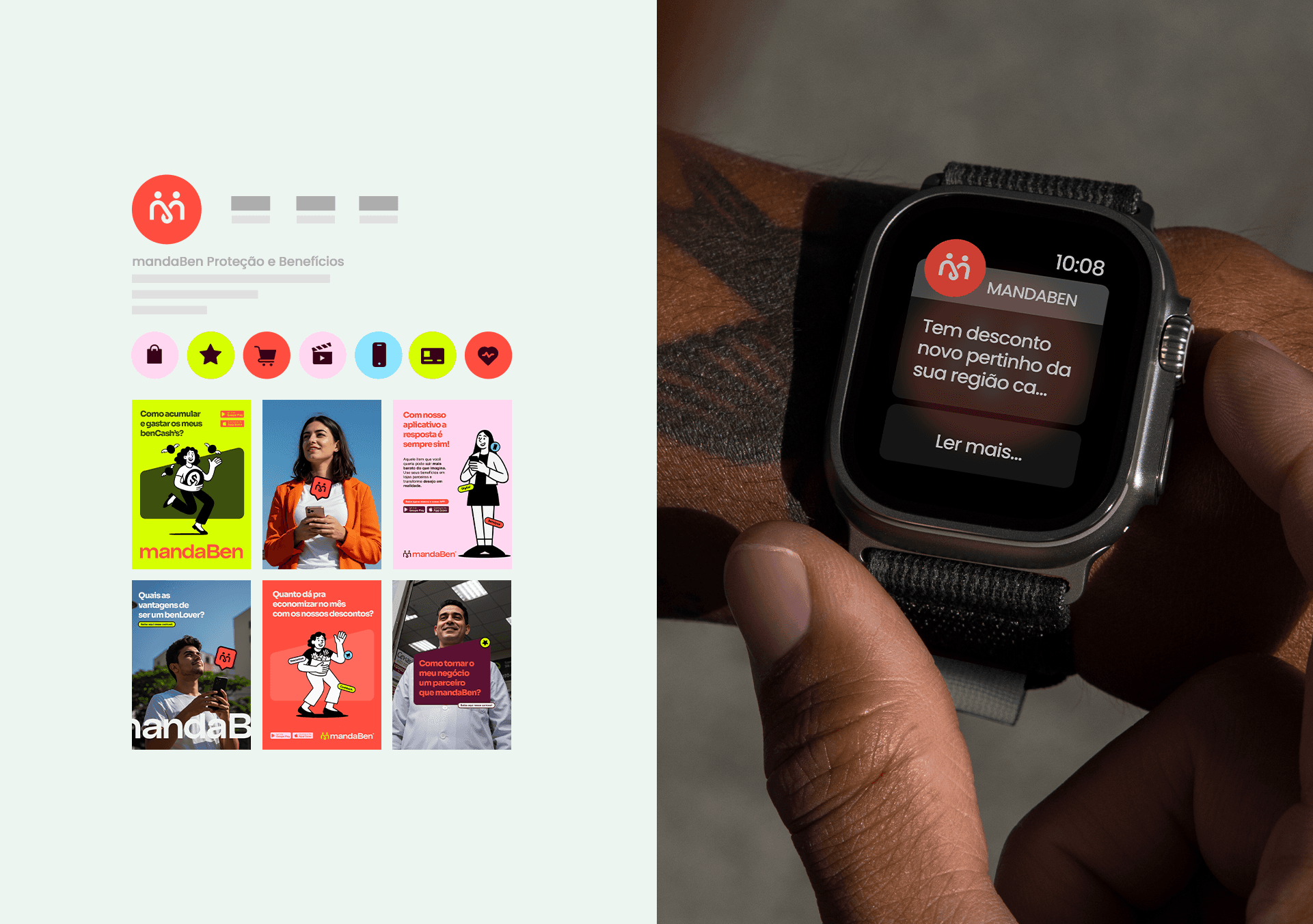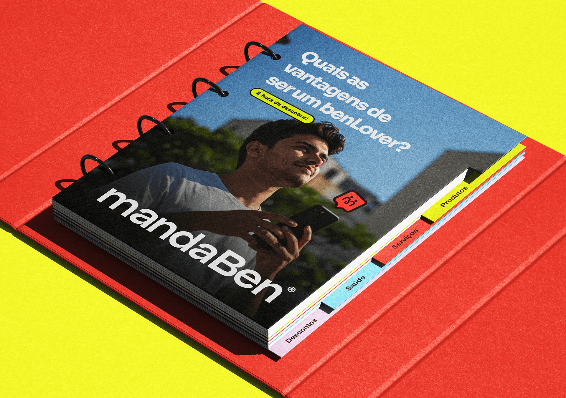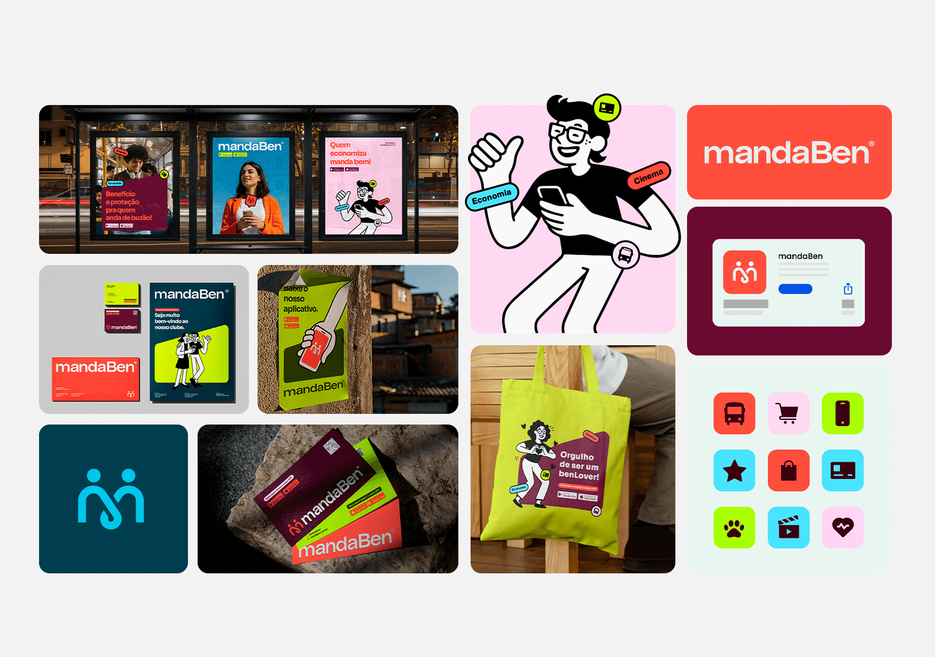 Identidade visual desenvolvida para a MandaBen, plataforma de benefícios voltada para famílias. O símbolo une três conceitos: a letra M, o laço como símbolo de comunidade e união, e as pessoas como centro de tudo. Formas arredondadas, tipografia amigável e uma paleta vibrante compõem uma marca acolhedora, alegre e com forte apelo popular.
